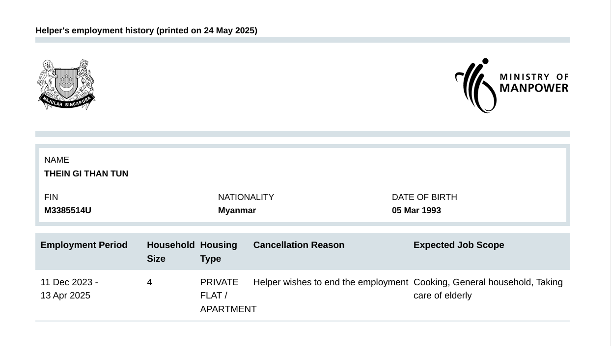 'THEIN GI THAN TUN, from Myanmar, has experience in general household work such as cleaning, laundry, ironing, etc. They are responsible, confident, and trustworthy. They speak English and are good with both children and the elderly.'