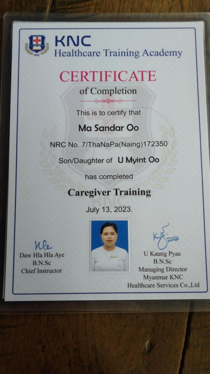 Special Mention | She has achieved Caregiver Training certificate in Myanmar |