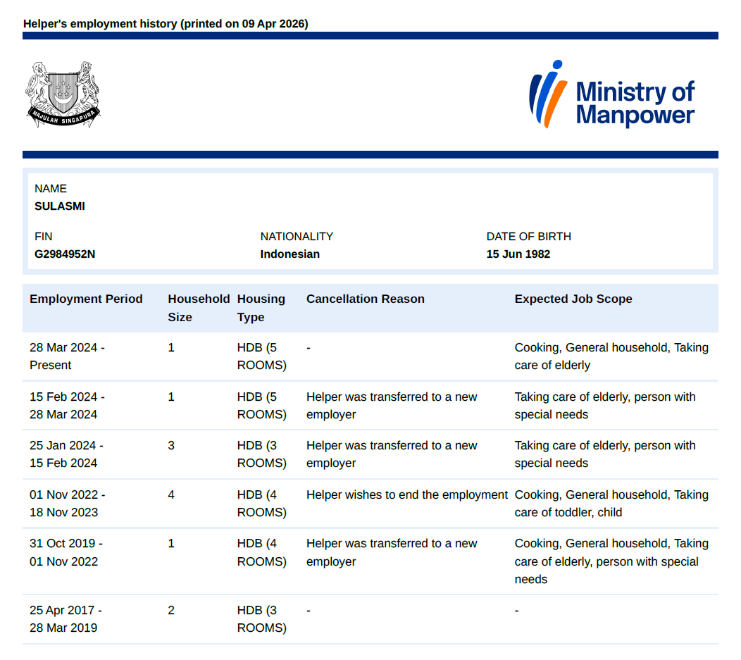 - Reason for leaving: Grandma speaks Cantonese, helper speaks Mandarin, comunication breakdown.