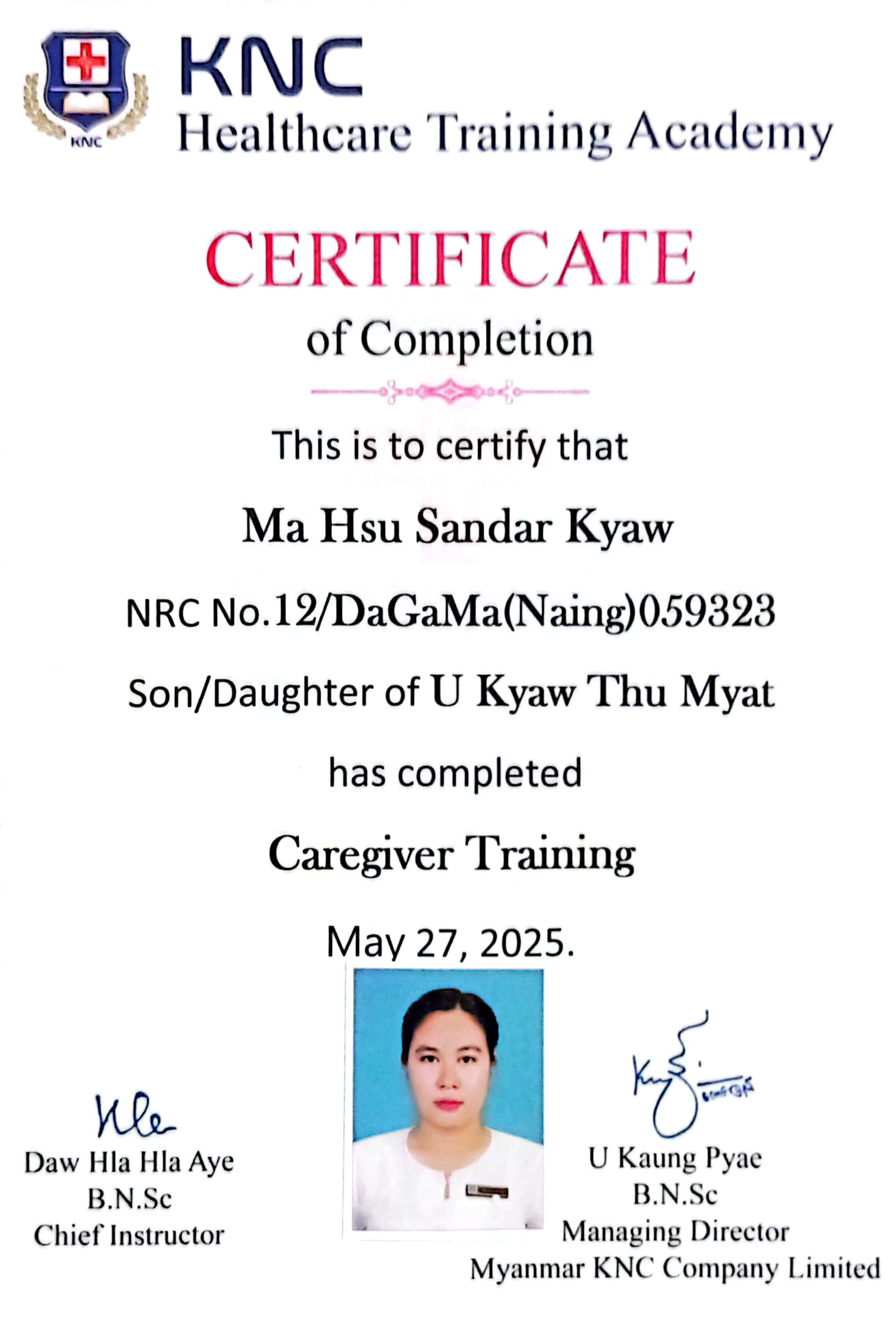 | Special Mention | She achieved Health Care Assistant Course in Myanmar |