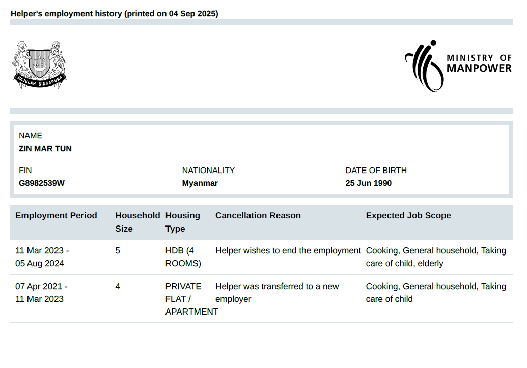 'ZIN MAR TUN, from Myanmar, has experience in general household work such as cleaning, laundry, ironing, etc. They are responsible, confident, and trustworthy. They speak English and are good with both children and the elderly.'